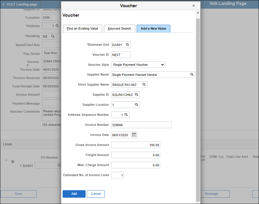 Verify the amount of the payment does not require a purchase order to be completed. If it does require a purchase order, create the voucher using the supplier OAKS ID. Place a comment on the voucher - Supplier in OAKS. Do not create a single pay voucher.