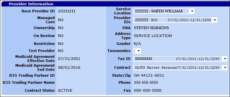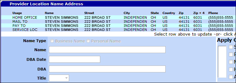 The Provider Location Name Address screen contains the providers name, address, telephone #, and e-mail address.