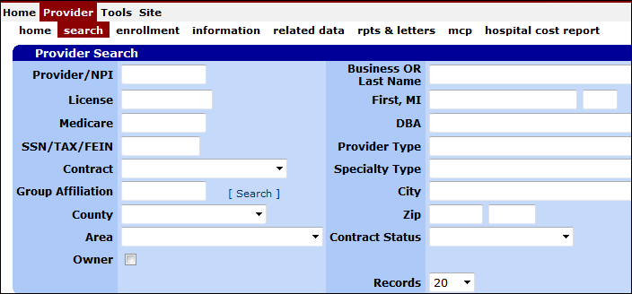 - A search can also be performed using the SS#, Tax ID#, or the provider name.