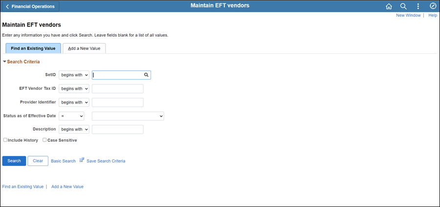 - If the provider record exists, the Maintain EFT Vendors tab displays with the provider information populated.