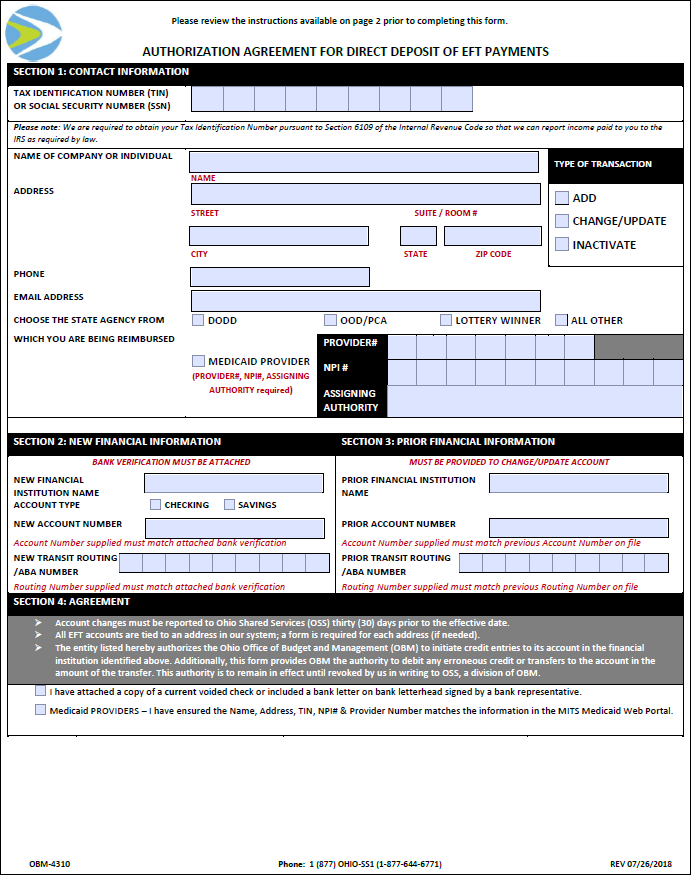 The preferred method of payment for the State of Ohio is EFT (Electronic Funds Transfer). The "Authorization Agreement for Direct Deposit of EFT Payments" (OBM-4310) is used to enroll in the EFT program and/or submit changes to the EFT information on the supplier record (see Entering or Changing Supplier EFT Information). Supplier Operations forms are available through the State of Ohio Suppliers website.