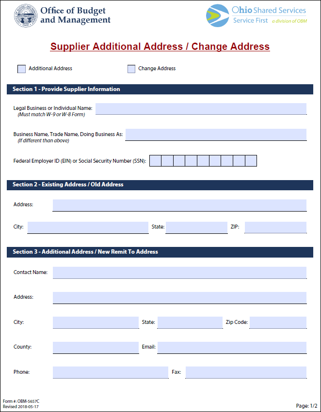 The Manage Addresses Form is used to establish or update a supplier record in OAKS FIN. Supplier Operations forms are available through the State of Ohio Suppliers website.